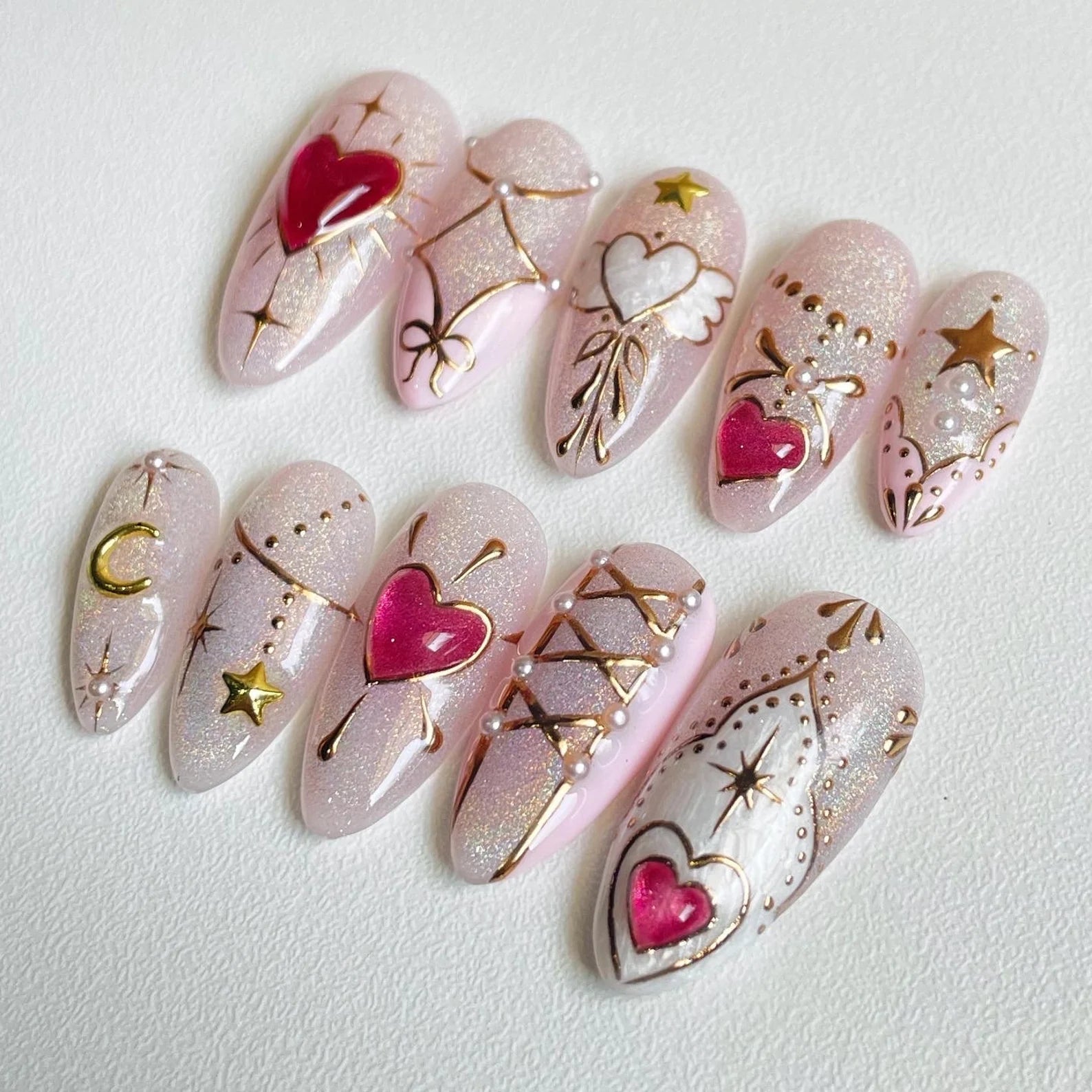 LM25 Kawaii Heart Themed Pink Rainbow Cat Eye & Gold Nails